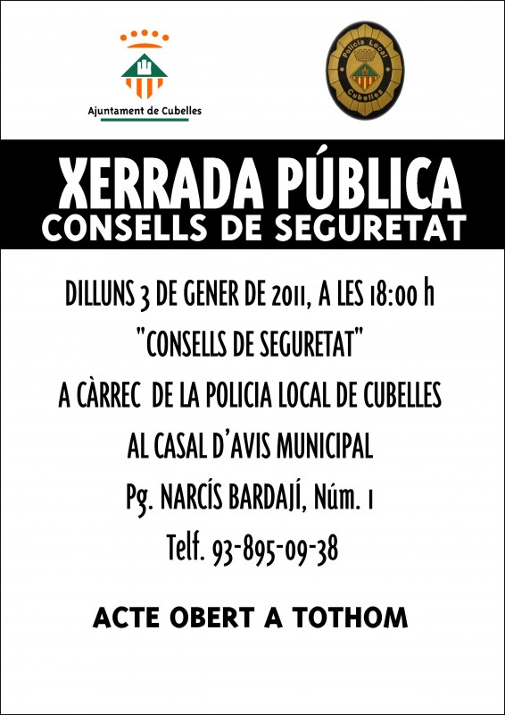 La Policia Local de Cubelles oferirà una xerrada en la que es donaran consells de seguretat als assistents. L’acte tindrà lloc el proper 3 de gener al Casal d’Avis municipal (Pg. Narcís Bardají, 1) a les 18h. i és obert a tothom.