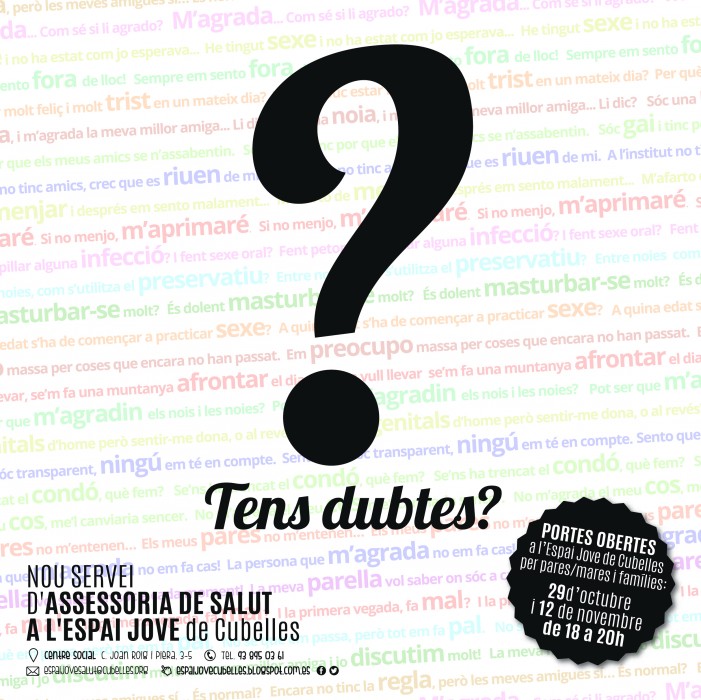 S’organitzaran xerrades informals, amb petits grups de joves a l’Espai Jove de Cubelles per tractar, debatre, plantejar dubtes, preocupacions i/o expressar les seves opinions sobre diferents temes que els afecten relacionats amb la seva salut i el seu benestar. També s’organitzaran “tallers de salut” per treballar temes com l’alimentació saludable, l’autoestima, o altres qüestions que afecten al seu desenvolupament integral de forma pràctica i interactiva.