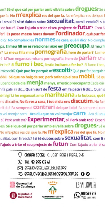 Establir i mantenir un diàleg continuat amb els i les joves a través de les xarxes socials (facebook, twitter, i altres) aprofitant els recursos físics i virtuals de l’Espai Jove de Cubelles, per tal de donar a conèixer, promoure i sensibilitzar a les persones joves en relació als hàbits i conductes saludables (salut física i mental, mobilitat segura i sosteni¬ble, afectiva i sexual, laboral, social, alimentària, etc.), amb llenguatges i canals efectius que els hi siguin propers.
